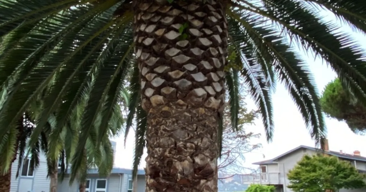 I was curious how the plants could root along the palm trunk. While palm trees will host epiphytes (plants that use the host tree for support but don't take anything from the host) in more tropical areas, fig trees and oak trees aren't epiphytes. It turns out that the crevices on the palm tree trunk can accumulate organic material. If somehow a seed or acorn reaches there, perhaps deposited by a bird or squirrel, there can be just enough light, water, and organic matter to allow the plant to grow.