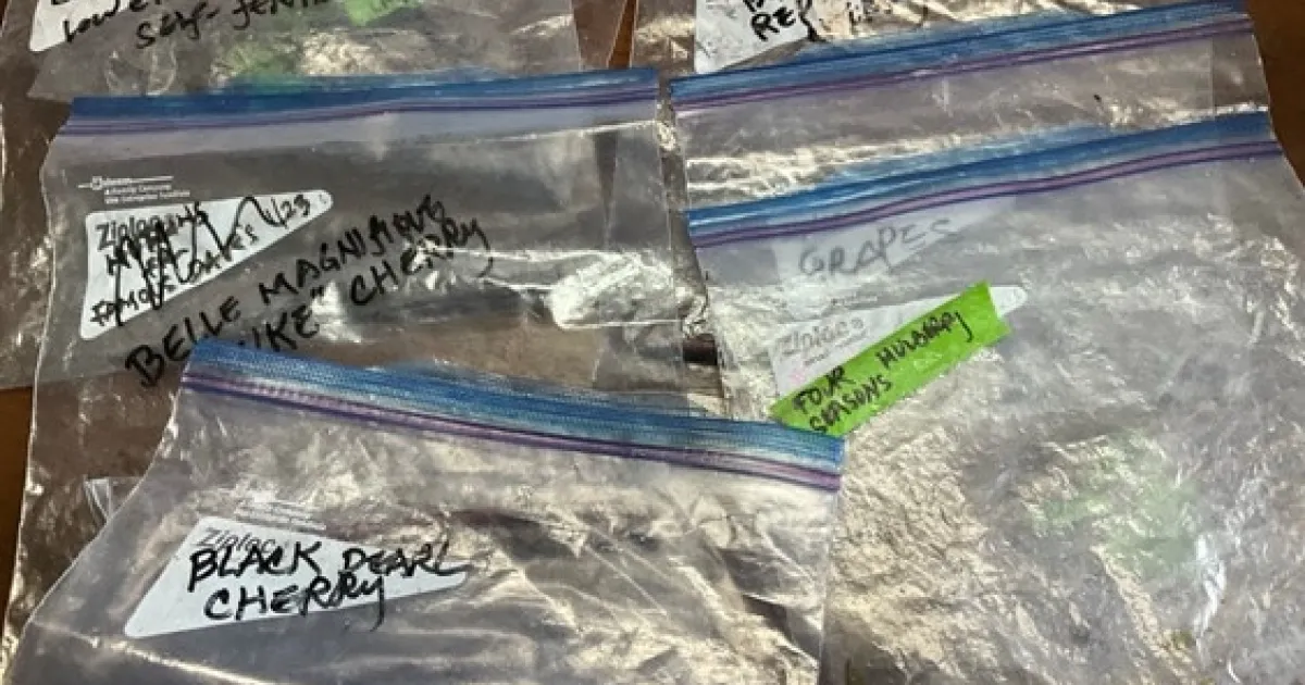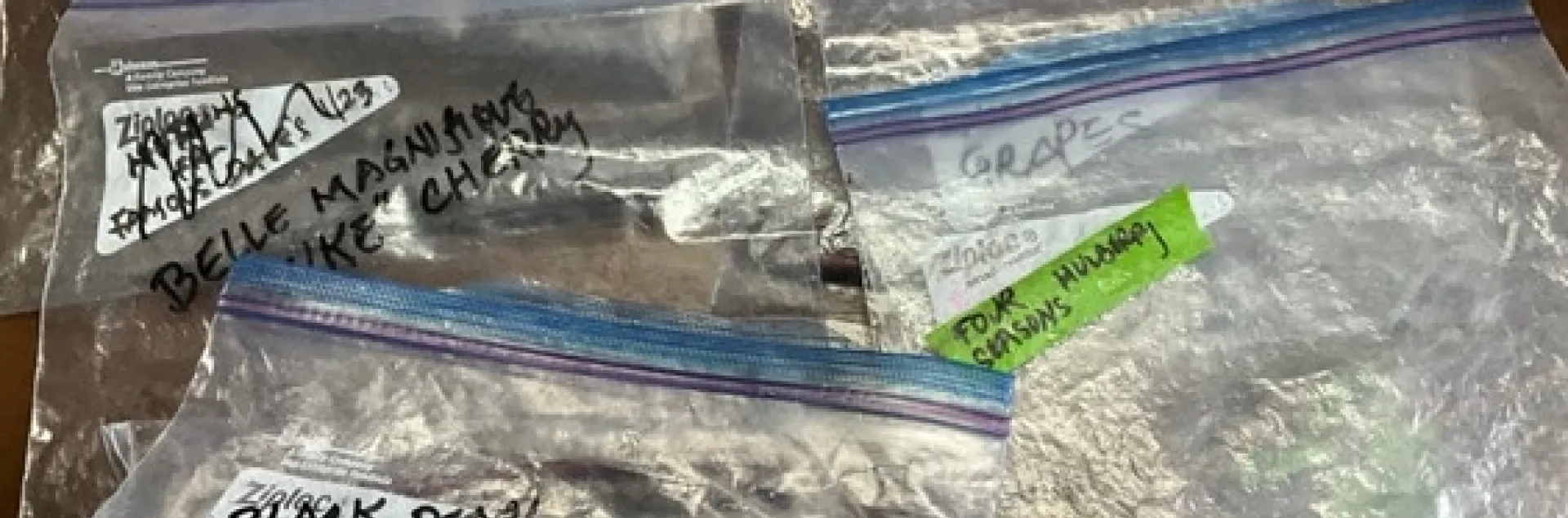 Here's how it worked: The tables were categorized by fruit names. In the fruit-named area were bags of twigs/branches (no leaves) labeled with the variety name of the fruit. We were instructed to take 1 to 2 pieces that we then put in a plastic bag that we brought to take home - Really simple. Except there were dozens, of varieties. And there