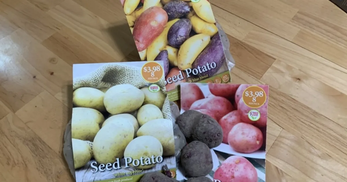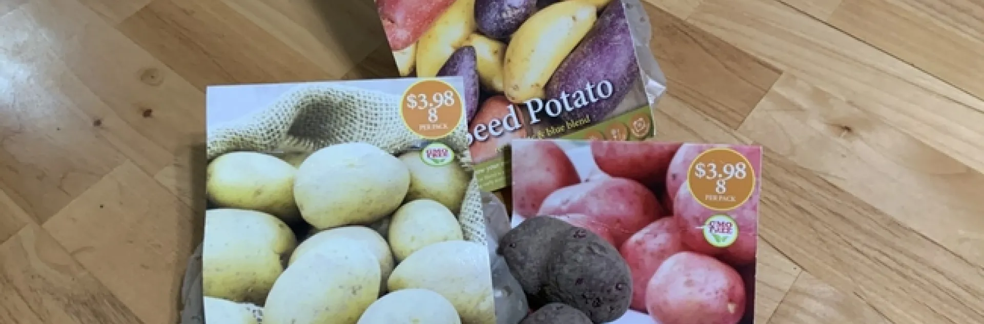- Red, white, and blue blend: late spring-early summer harvest. (Some pictured on package look like fingerling)