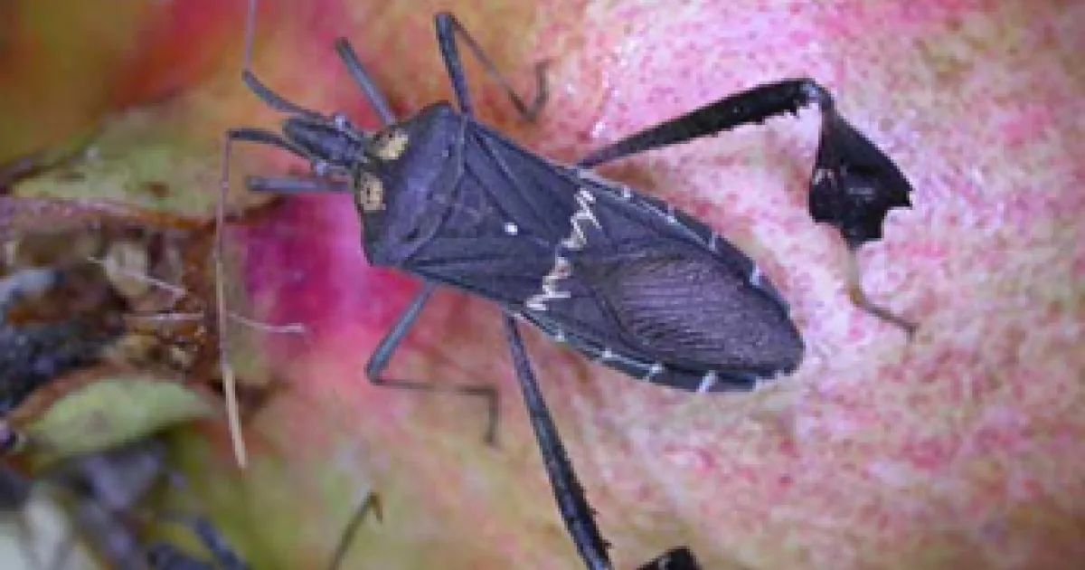 Leaffooted bugs have a narrow brown body with a length of .75 to 1 inch long. They feed on fruits, fruiting vegetables, ornamentals and nuts. They have piercing-sucking mouth parts that help them feed on plant parts and particularly seeds. Leaffooted bugs have small leaf-like enlargements on their hind legs.
