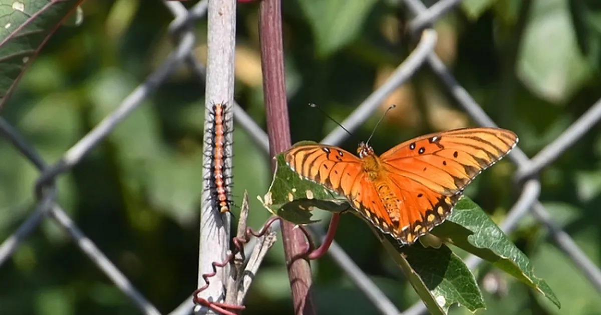 The caterpillars (larva) are shiny orange with black spines, and grow very quickly. The fritillary larvae will hang around munching on the passion vine for 2-3 weeks, and then go off to chrysalis. The chrysalis (pupa) will look like dead leaves and requires 5-10 days to pupate. The new butterflies will emerge and live for 4-6 weeks in warm weather.
