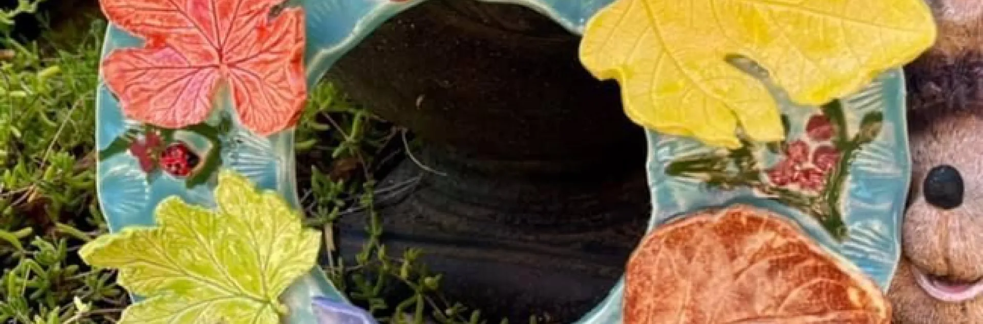 I really looked forward to her classes. They would always begin with a stroll around her gorgeous garden for inspiration. The first picture shows my leaf wreath, where I picked leaves in her garden that were then rolled onto the prepared clay, cut and affixed to the wreath form.