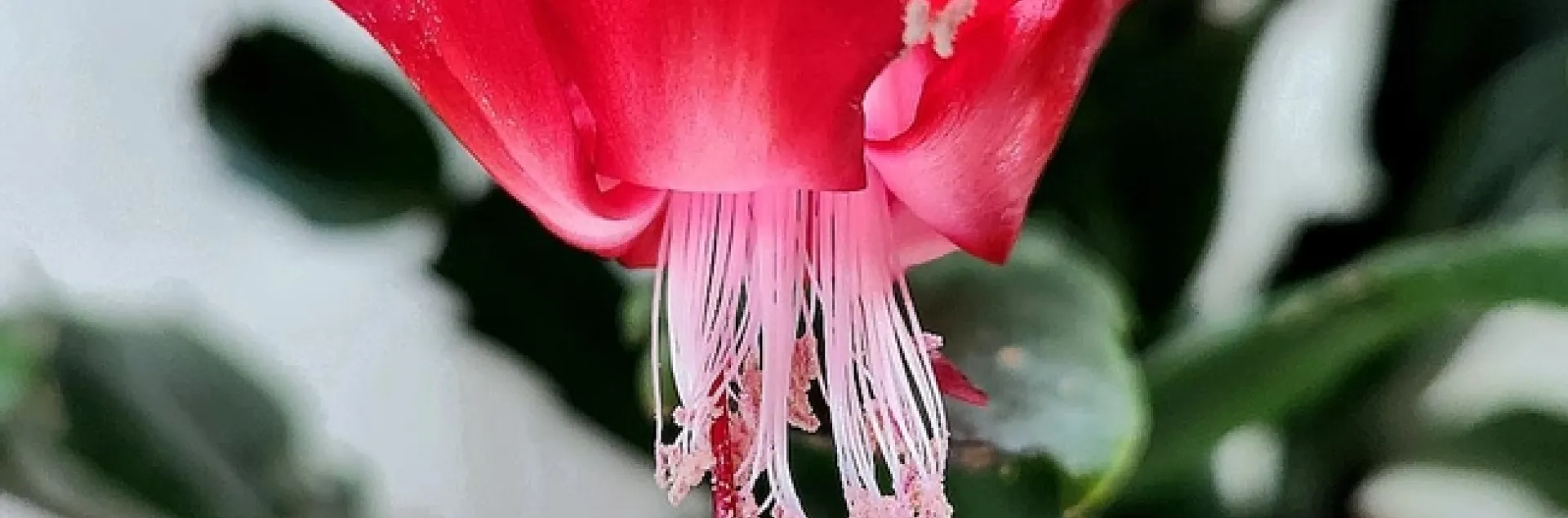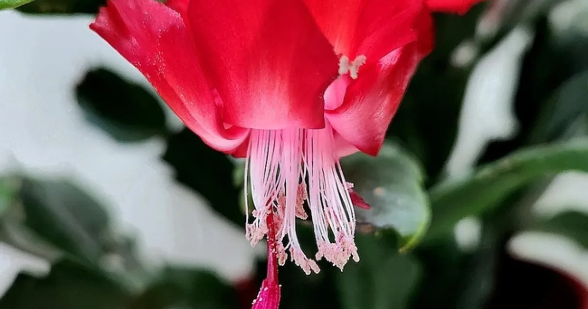 We have an enchanting little plant that sits on our kitchen counter.  This plant has many common names, such as Thanksgiving cactus, crab cactus, Easter cactus, and holiday cactus, but is most known as the Christmas Cactus (Schlumbergera).  This delightful plant is currently blossoming with spectacularly bright-red tubular flowers that hang delicately from small and strong succulent branches.
