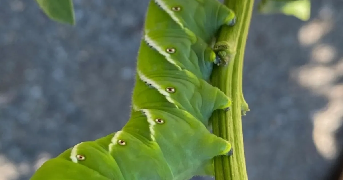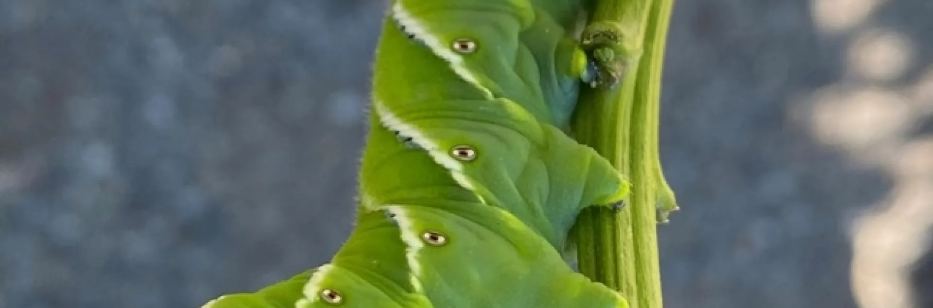 Both species feed on common garden plants like tomatoes, potatoes, peppers, and eggplants. Looking at my picture, I've identified my pest as a tobacco hornworm: parallel white stripes with dotted black lines lining each of their stripes and a red “horn” on the tail end. In our warmer climates, we are more likely to see the tobacco hornworm devouring our gardens. This pest is very recognizable, but hard to find as they blend in quite easily with the green foliage. Two tomato hornworms can defoliate an entire tomato plant.
