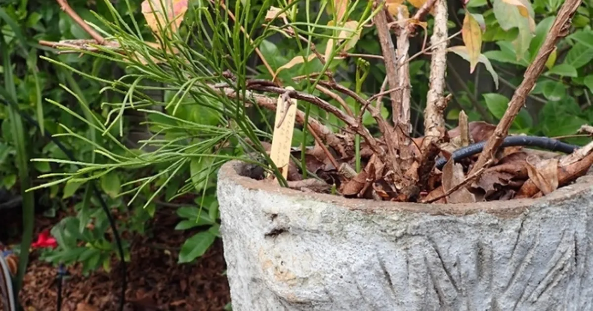 In January 2022, when pruning back a hybrid Fuchsia ‘Angel's Earrings,' I was startled to discover a strange plant sharing its pot. The fuchsia had lived in our Suisun City yard since I bought it at the San Francisco Botanical Garden over a decade ago. By “strange plant,” I mean that the interloper looked weird and wasn't any weed or cultivated garden plant that I recognized. And by “weird,” I mean way unlike any other plant I was familiar with. For starters, the long, branched stems were unjointed and had no leaves. Herewith are two photos taken that winter.