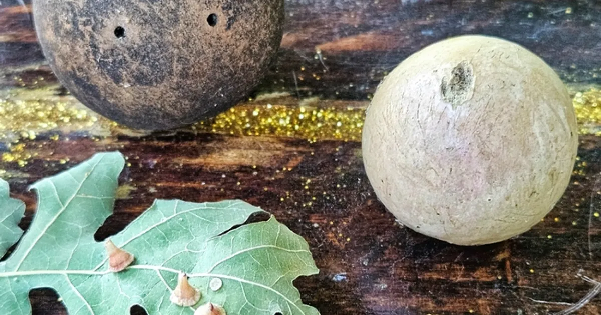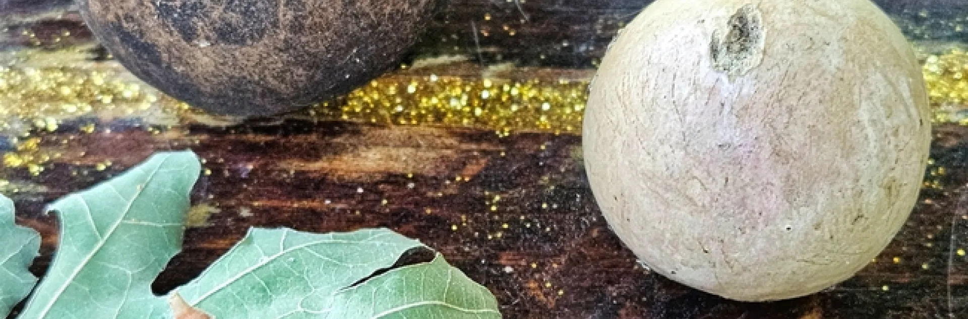 Our neighboring tree is a wonderful old Oak that majestically towers over our homes, seeming to watch over us and keep us immersed in delightful nature. In late summer and early fall, the tree drops many interesting bits into our yard, such as acorns that feed squirrels and oak galls, ball-shaped growths that cluster in the high branches.