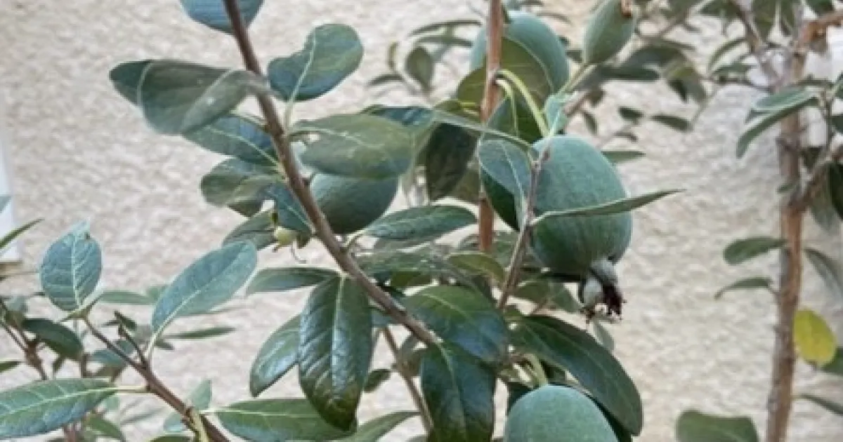 Our first feijoa was planted by the landscaper in our stone retaining wall 22 years ago. It is now a big tree. Some years, it is covered in flowers but they always drop in spite of regular watering. What I should do is accept that we will never have fruit, and just eat the edible flowers. The second plant is in our front yard in full sun. Afternoon sun in super hot Fairfield summers is too much for feijoa. It has fruited sporadically (and lightly) some years. However after a pruning 2 years ago, it looks healthy and yet has not produced. The third bush was planted next to a persimmon tree that is crowding it. We decided to just let the persimmon flourish in the limited space.