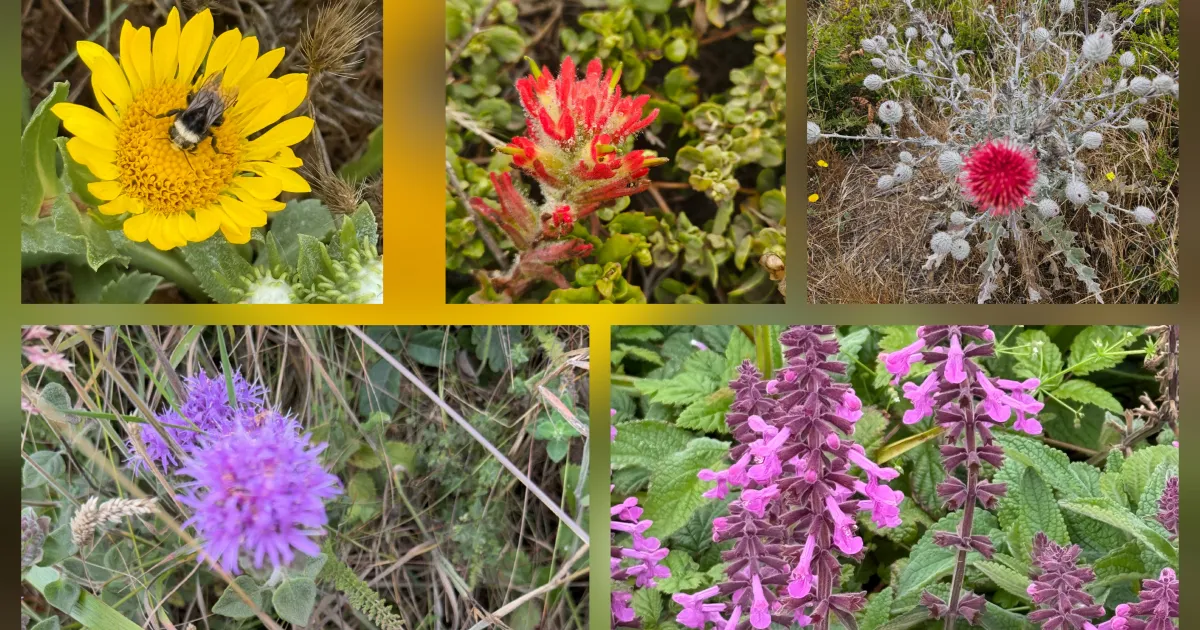 The Curlycup gumweed (Grindelia squarrosa) is a flowering plant that belongs to the Asteraceae family. The Hedge woundwort (Stachys monnieri) is a perennial plant that belongs to the Lamiaceae family. The Yellowspine thislte (Cirsium ochrocentrum) is a species of thistle native to the Western US. The Coyote mint (Monardella villosa) is also part of the Lamiaeae family. The Coast Indian paintbrush (Castilleja affinis spp. litoralis) is a wildflower that belongs to the Castilleja family.