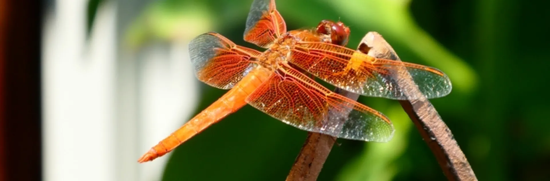 Each summer I anticipate the annual return of a dragonfly to my backyard patio-pool area. Like clockwork, this Odonata anisoptera appears, perching atop a narrow 3' high metal garden trellis, surveying the pool before zooming down to encircle the water. Its reddish salmon colored body (head, abdomen, thorax) and transparent red-veined wings are but a blur as it flits through the air, hovering, diving, swooping up its prey.