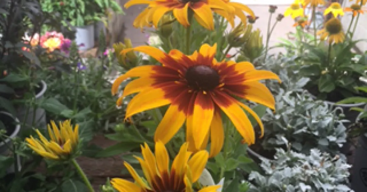 There are several cultivars of this perennial flower commonly known as the Black Eyed Susan. One of the cultivars you have most likely seen in the landscape and nurseries is R. hirta ‘Indian Summer' which gained popularity in 1995 as a winner from the All-American Selections. It is an herbaceous perennial plant growing between 2-3' high and wide. It is drought tolerant once established and can easily be grown from seed, blooming the first year. It is in the Asteraceae family and has a composite flower in orange and yellow tones with a prominent cone-shaped head. All are native to North America, and mostly have hairy foliage, which is what hirta means. There are so many new varieties to choose from. I have 3 in my garden at this time, and they are stunning with a very long bloom time all summer long, also attracting bees and butterflies. They also make a fabulous addition to fresh-cut floral arrangements. I took a few shots of some of the varieties I am seeing at the nursery and my own. One of the more popular ones I have seen lately is called an Echibeckia, a cross between an echinacea and rudbeckia. However, I don't think it looks anything like an echinacea other than having a cone and daisy-like florets. I would highly recommend either the rudbeckia or the crossed one to anyone looking for a beautiful, super easy plant to grow.