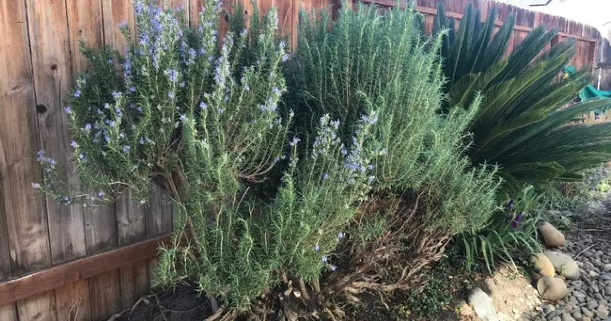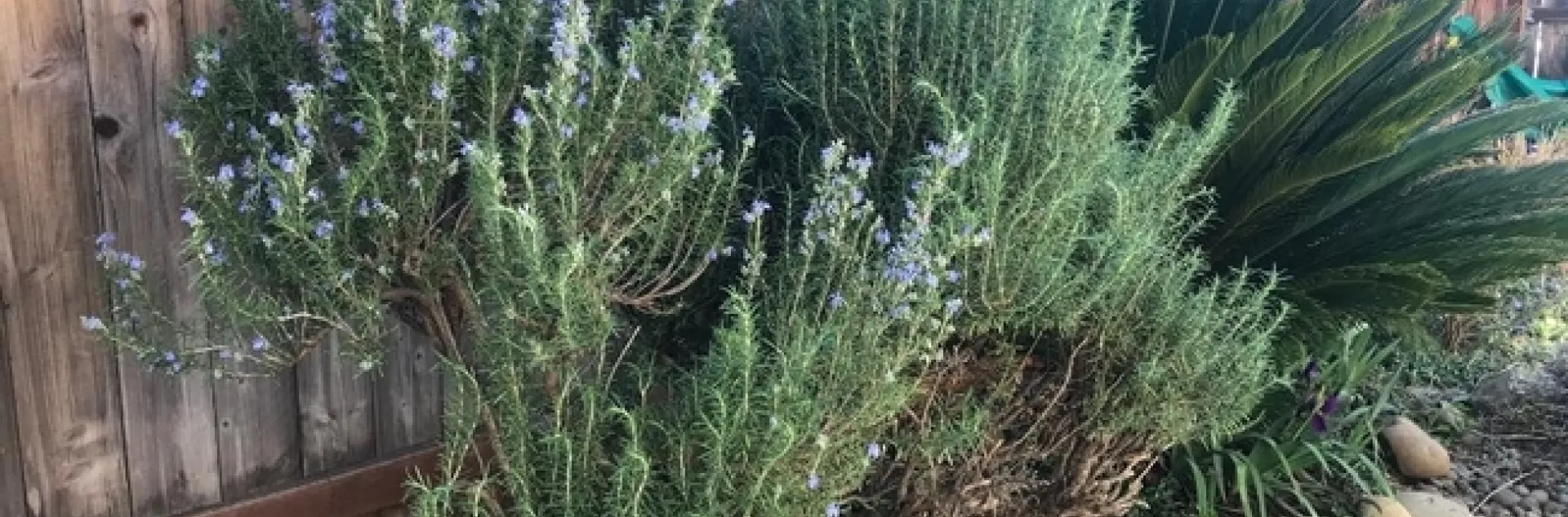 I was in charge of cutting the rosemary. I avoided the left side of the shrub because it didn't have branches that were long enough for a wreath, possibly from being pruned last year. So, I cut extensively on the right side. That December pruning, never an optimal time, stimulated branch and leaf growth, but at the expense of early spring blossoms. Because the left side hadn't been touched, it had beautiful flowers. Because rosemary is so hardy, I expect the right side to bloom later in the season.