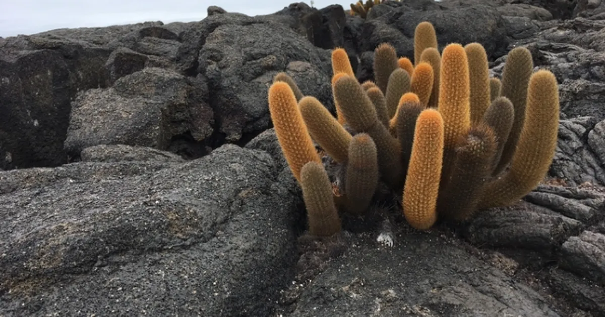 We found Prickly Pear Cactus, Optunia on many islands.  It has evolved into six endemic species in the Galapagos:  Optunia echios, O. galapageia, O. helleri, O. insularis, O. axicola, and O. megasperma.  It looks like the cactus we are familiar with, but stuck on top of a tree trunk.  The tree trunk portion of the plant is taller on the islands that have giant Galapagos tortoises.  The tortoises use them as a food source as do land iguanas, cactus finches, and mockingbirds.