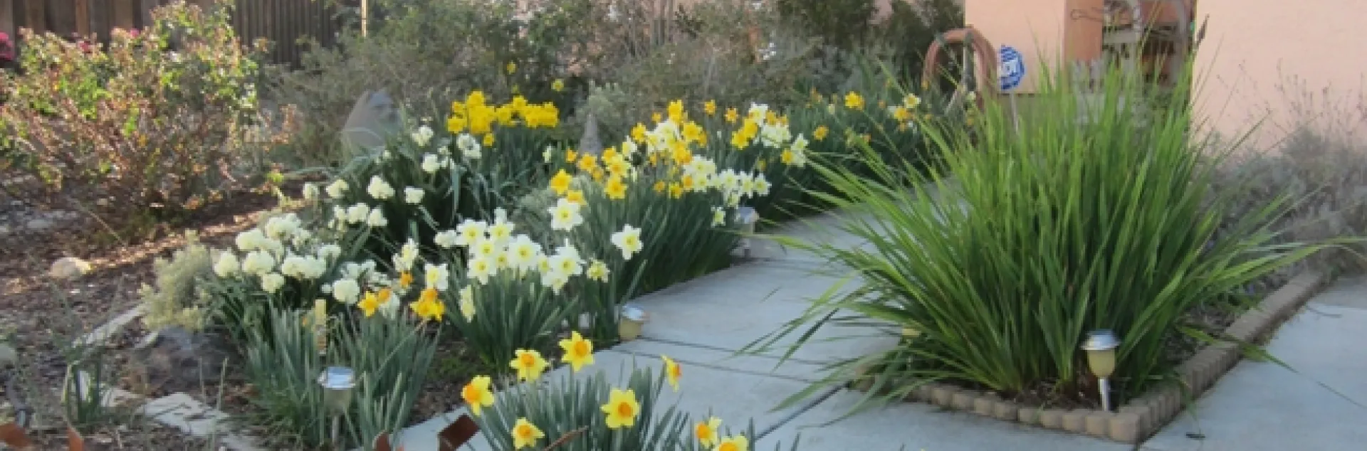 In the pictures I have included, you will note that my front yard is really a spring garden with roses, verbenas with a short background of Nerium oleander ‘Petite Red'. I've tried other later blooming plants out there, but the hot winds of Suisun really took a toll on them and burnt leaves are really not my thing. On the other side of the driveway is the last remaining African sumac (Rhus lancea) which will be leaving soon. A wonderful tree for bees – it's a winter bloomer – and you can hear the buzzing of wings from the front door. Since it's a pollinator favorite, I hate to remove it, but the suckers growing in the neighbor's block retaining wall and into the cracks in that side of the driveway; so this will be its final year! However, all it not lost as that will make room for 2 more very small Magnolia – an evergreen white flowering variety and an evergreen pink flowering variety (you notice that I've blanked out on their names.