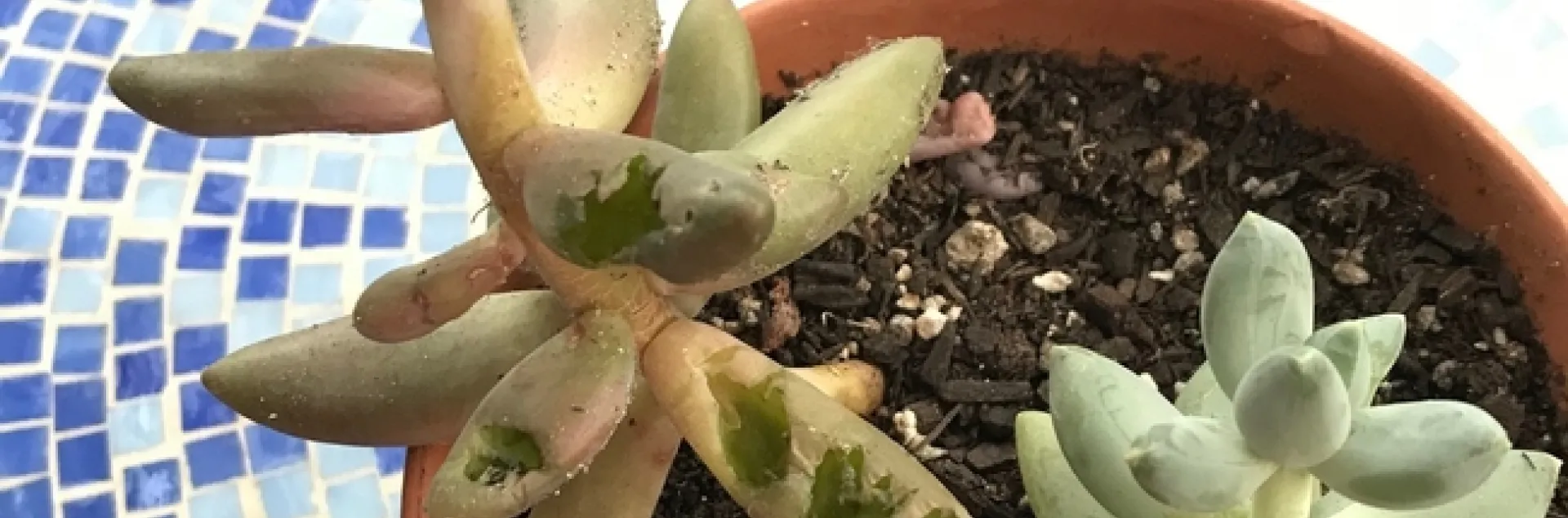 The next day I went out to find the Pachysedum had been attacked! Several of its leaves bore nibble marks. Now its neighbor, the Pachyphytum, hadn't been touched at all