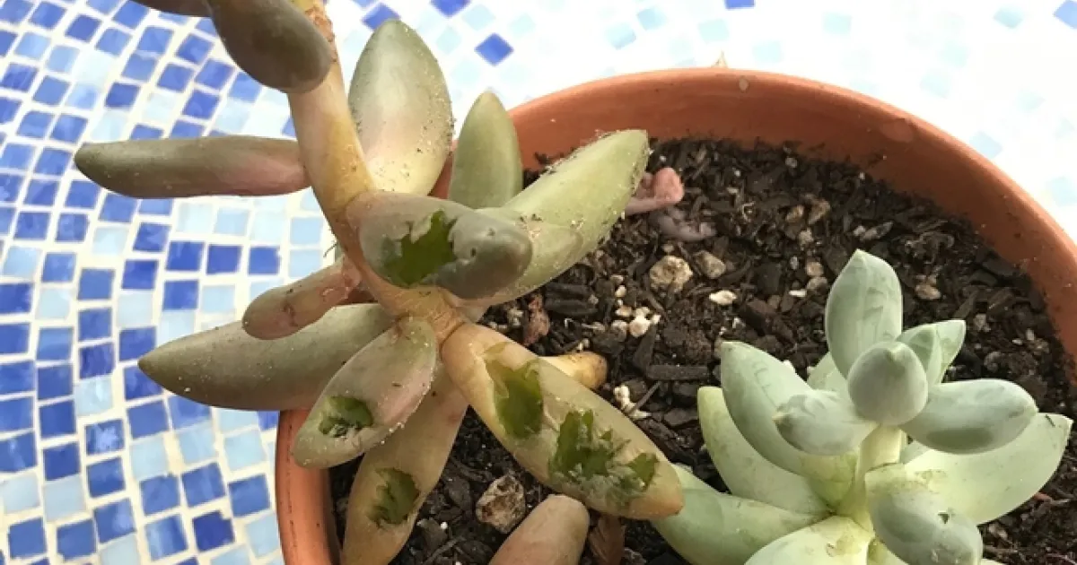 So, everything was doing well initially. They looked very attractive together. I had the pot on my back patio against the wall of the house and under the patio cover. But gradually the Pachysedum ‘Ganzhou' started to elongate. Now, this was the plant that was supposed to be the shorter of the two. I thought it might be reaching for the sun. So, I removed the pot from its protected position, nestled behind several rows of other plants, and put it right in the front row.