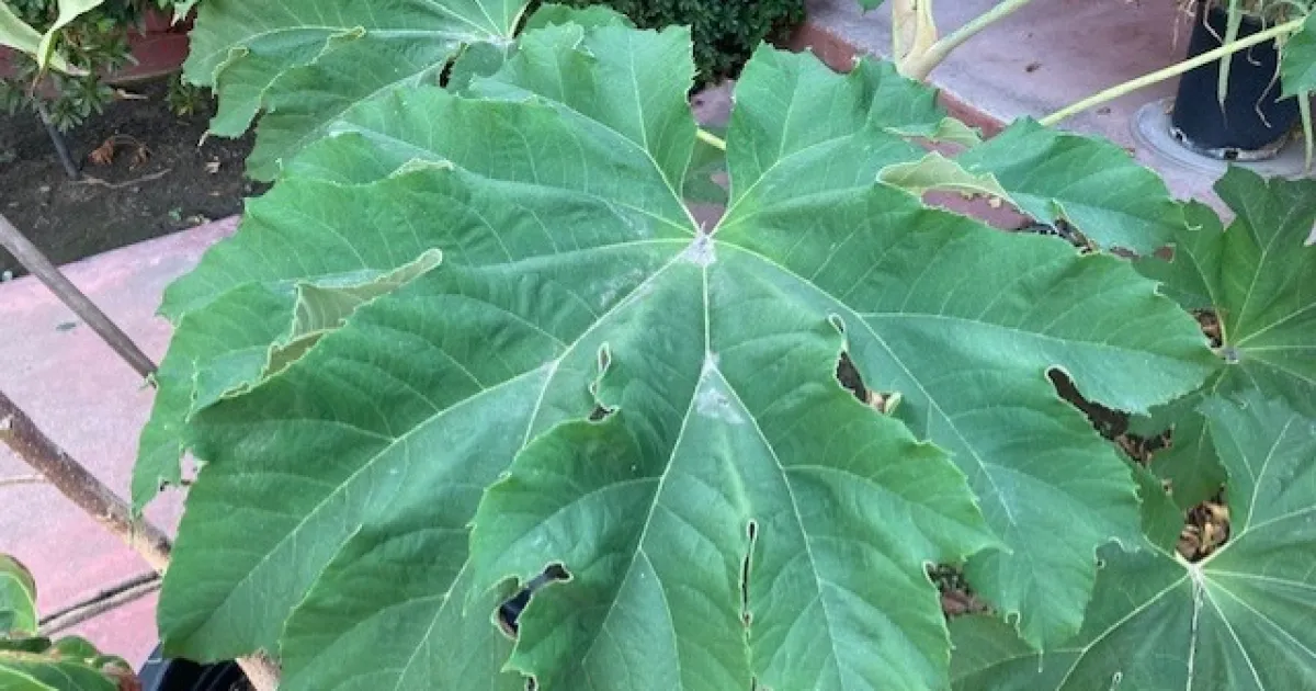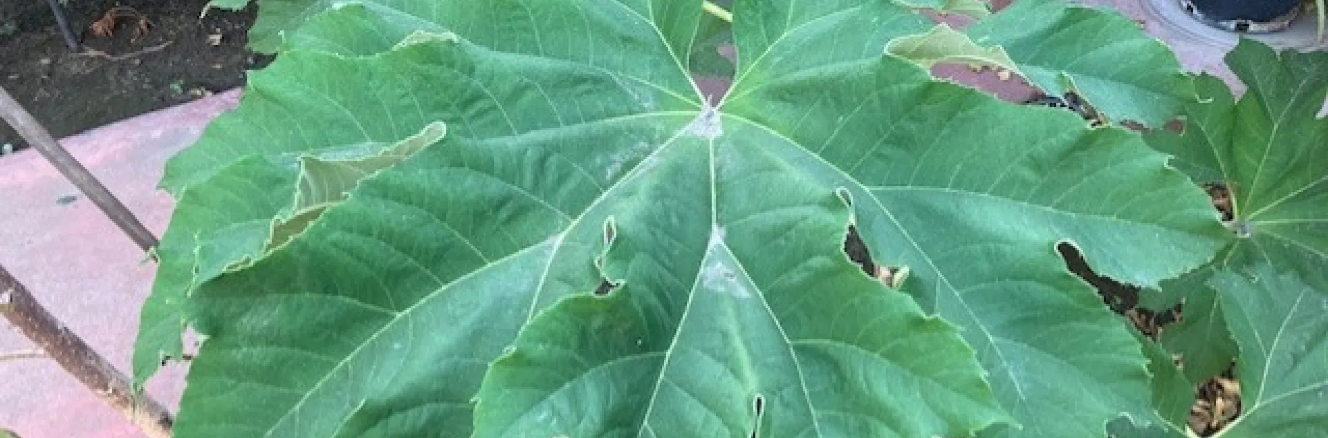 It is commonly found in Asian-style gardens as an evergreen background. It's native to Taiwan. You may recognize it by the huge leaves described as palmasect, having up to a dozen or more lobes. The gray-green leaves easily reach 15 inches across, are hairy on the underside and have long, hairy petioles. Propagation is by division, root cutting or seed. They grow well in sun or partial shade and in clay, sand or loam. They are also very fast growers. In California's Central and Sacramento Valley, a good hard freeze will take these plants/trees down to the ground, but they resiliently resurrect come spring.