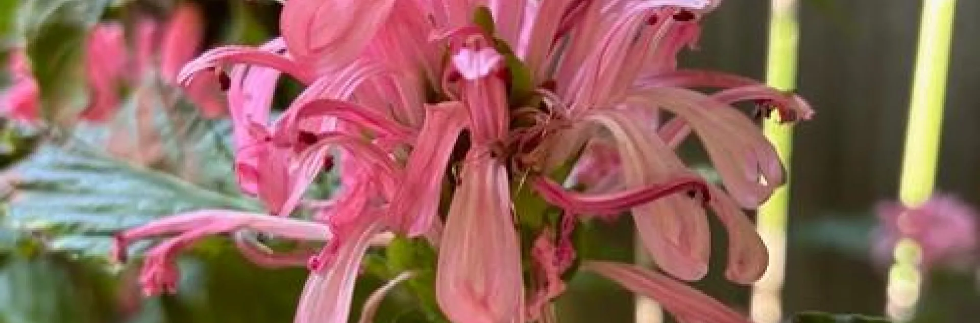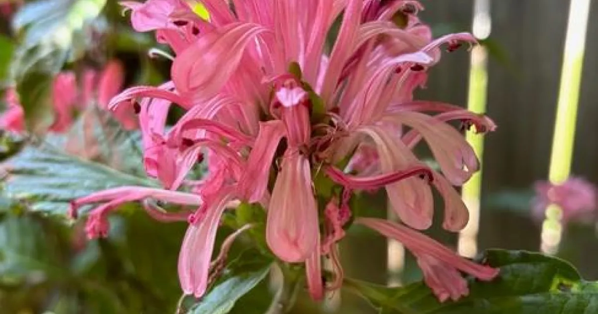 But what stood out from all the rest was a large shrub that filled the corner of his backyard. It had impressive clusters of pink, tubular, petaled flowers. My friend told me the plant had been his deceased wife's pride and joy. He couldn't remember its name, though. I used one of the plant ID apps and found that it was Justicia carnea. Some of its common names are delightful: Brazilian Plume Flower, Flamingo Flower or King's Crown. It is in the Acanthaceae family and had once been in the Jacobinia genus but was changed to Justicia genus. It is native to a few South American countries.