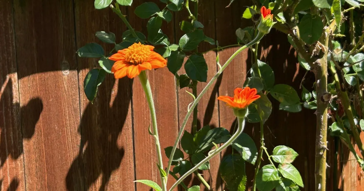 This variety gets to be 4-5 feet tall, so with our winds, I may need to protect them with some stakes. They love full sun and regular water and can stand extreme heat. They bloom better when they are deadheaded, removing the spent blossoms. The stems are hollow and a little delicate. There is a wonderful overview on growing Mexican Sunflowers at hort.extension.wisc.edu/articles/mexican-sunflower-tithonia-rotundifolia/