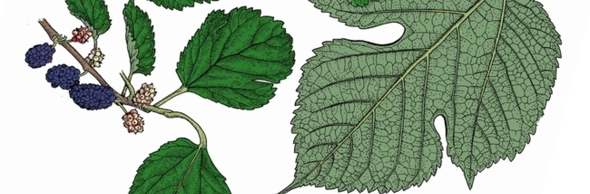 The leaves of the white mulberry tree are grown to feed silkworms. It's cheap food for them. The ‘Silk Road” from Turkey to China brought many products of silk into the trade industry. China and India are the two main producers of silk today. In 1733, General Oglethorpe imported 500 white mulberry trees and tried to start the silkworm industry. But everyone ended up using the trees for fruit and to feed their livestock.