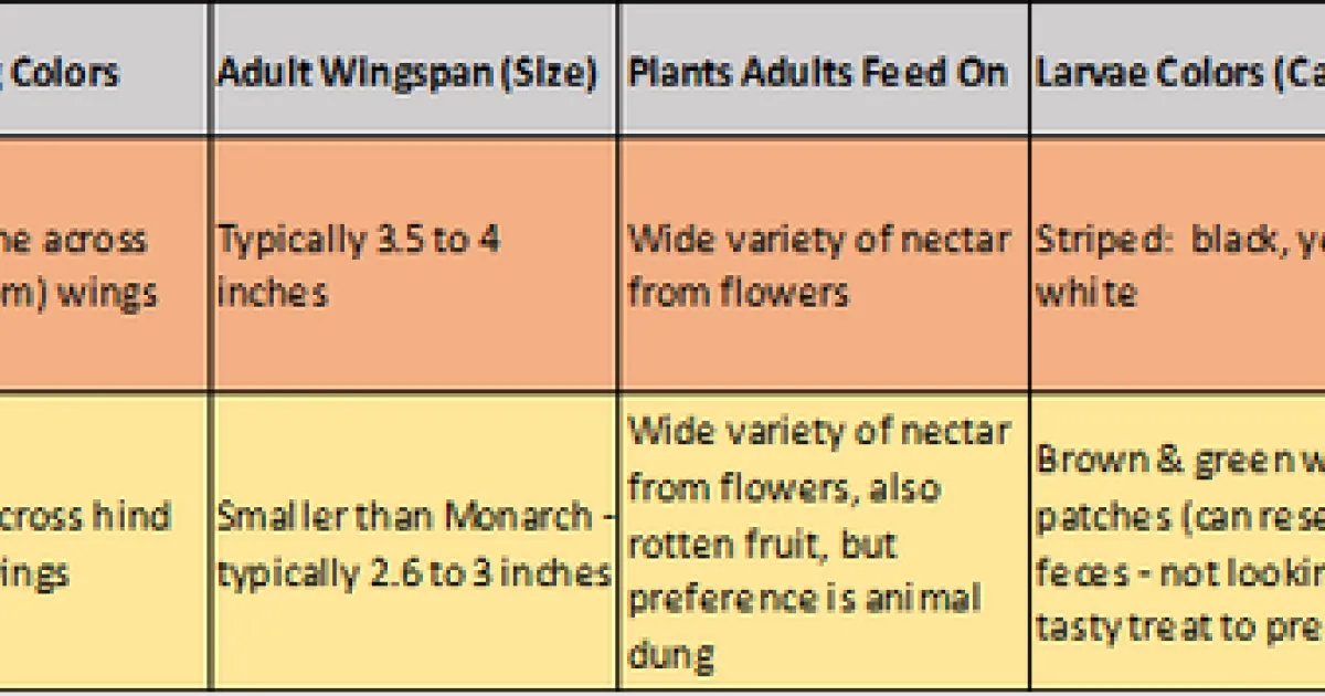 In case you are now wondering whether you are seeing a Monarch or Viceroy butterfly in your garden or during travels, below are some pictures of each type of butterfly from Ranger RobbHannawacker, and a table identifying their differences.