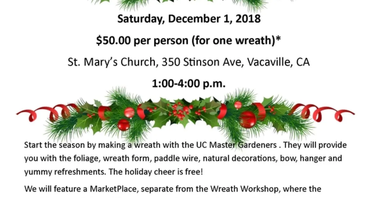 November 25, 2018By Jennifer M Baumbach Print Solano SolanoJoin the UC Master Gardeners of Solano County and learn how to make a beautiful wreath from fresh greens. Space is still available. See flyer for more details.
