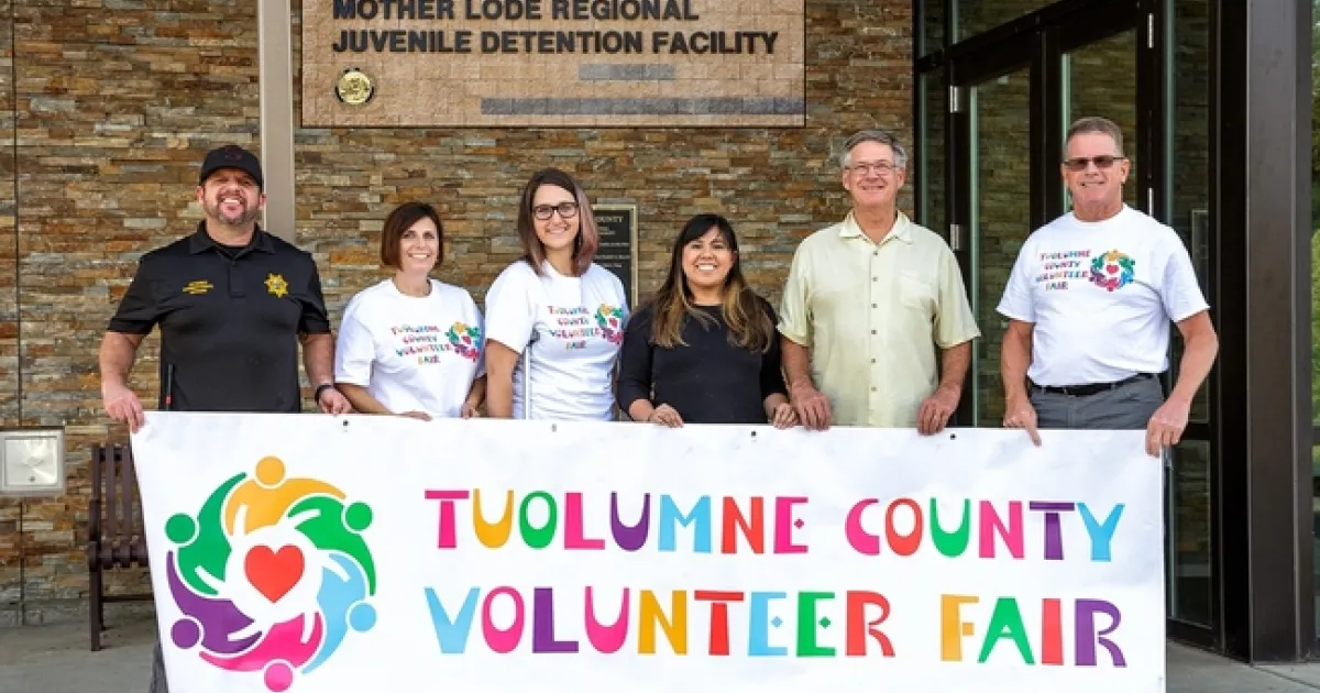 Volunteer Fair staff, Tuolumne County Probation Staff, and local volunteer stand behind Tuolumne County Volunteer Fair banner.