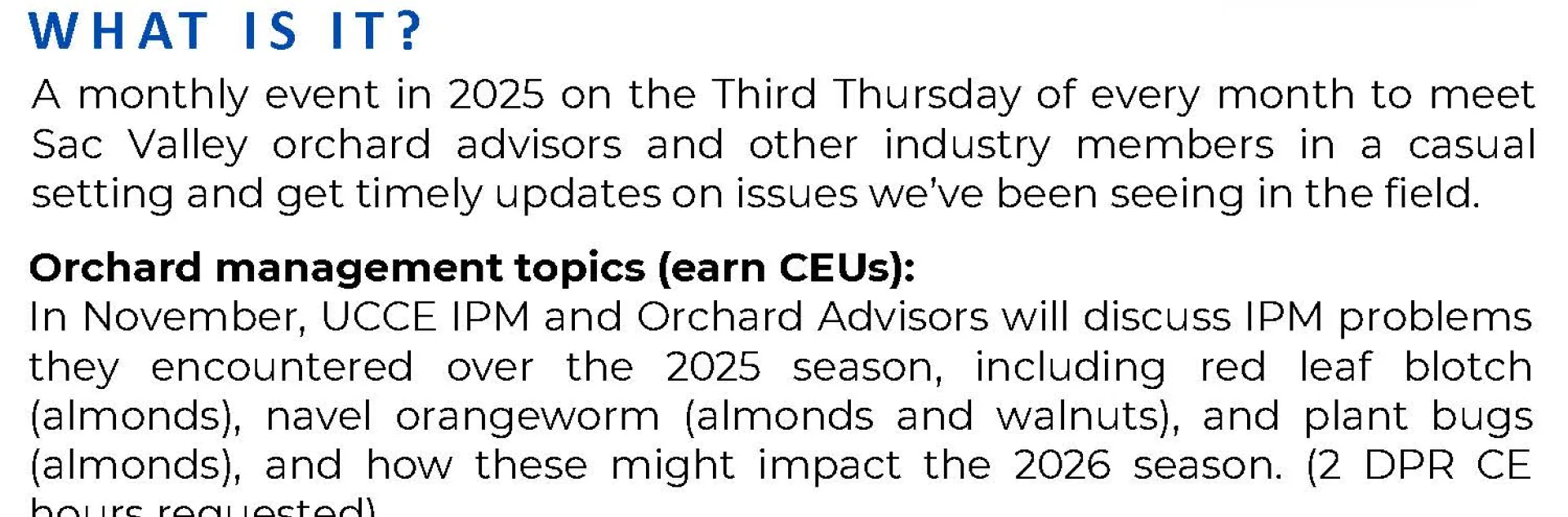 Following the presentation, enjoy an open discussion where you can share your own orchard observations, photos, and questions. This is a great opportunity to connect with UCCE advisors and fellow growers in a relaxed, conversational setting.