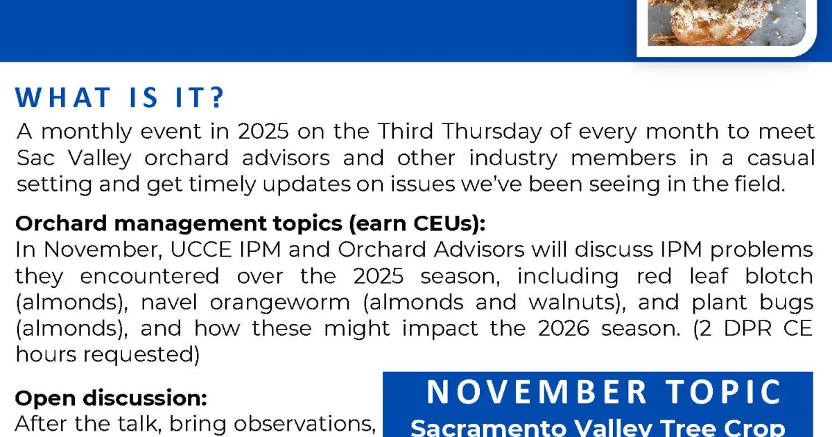 This month’s topic, Sacramento Valley Tree Crop IPM Review – 2025, will feature a discussion on pest and disease issues encountered throughout the season — including red leaf blotch, navel orangeworm, and plant bugs — and how these challenges may influence management decisions in 2026.