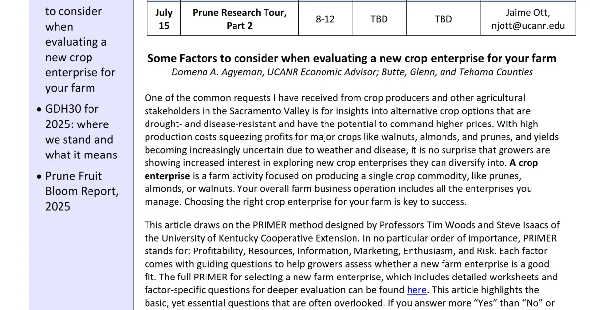May 28, 2025By Becky Wheeler-Dykes Print In This Issue: Save the DatesSome Factors to consider when evaluating a new crop enterprise for your farmGDH30 for 2025: where we stand and what it meansPrune Fruit Bloom Report, 2025Documents Glenn County UCCE Sacramento Valley Prune Newsletter - May 2025 - Part 2 Glenn County UCCE Sacramento Valley Prune Newsletter - May 2025 - Part 2