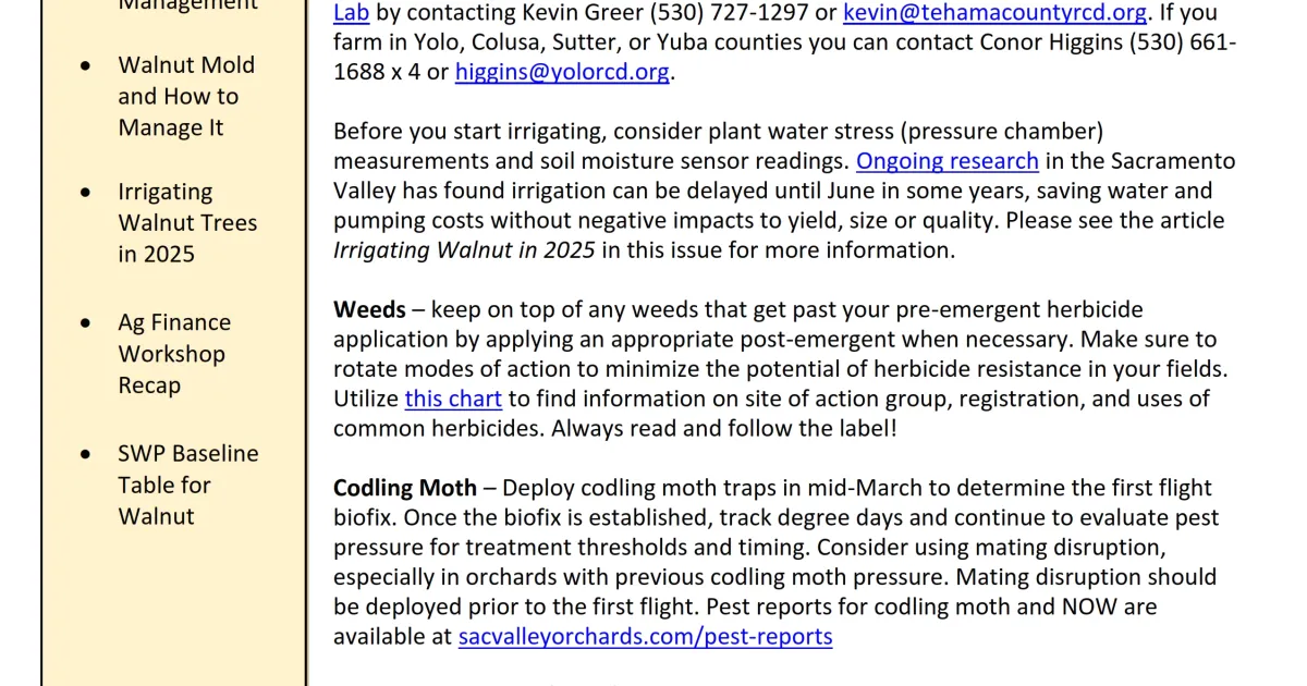 April 9, 2025By Becky Wheeler-Dykes Print Glenn WalnutsIn this Issue: April – May Orchard TaskWalnut Blight ManagementWalnut Mold and How to Manage ItIrrigating Walnut Trees in 2025 Ag Finance Workshop RecapSWP Baseline Table for WalnutDocuments Glenn County UCCE Sacramento Valley Walnut Newsletter - Spring 2025 Glenn County UCCE Sacramento Valley Walnut Newsletter - Spring 2025