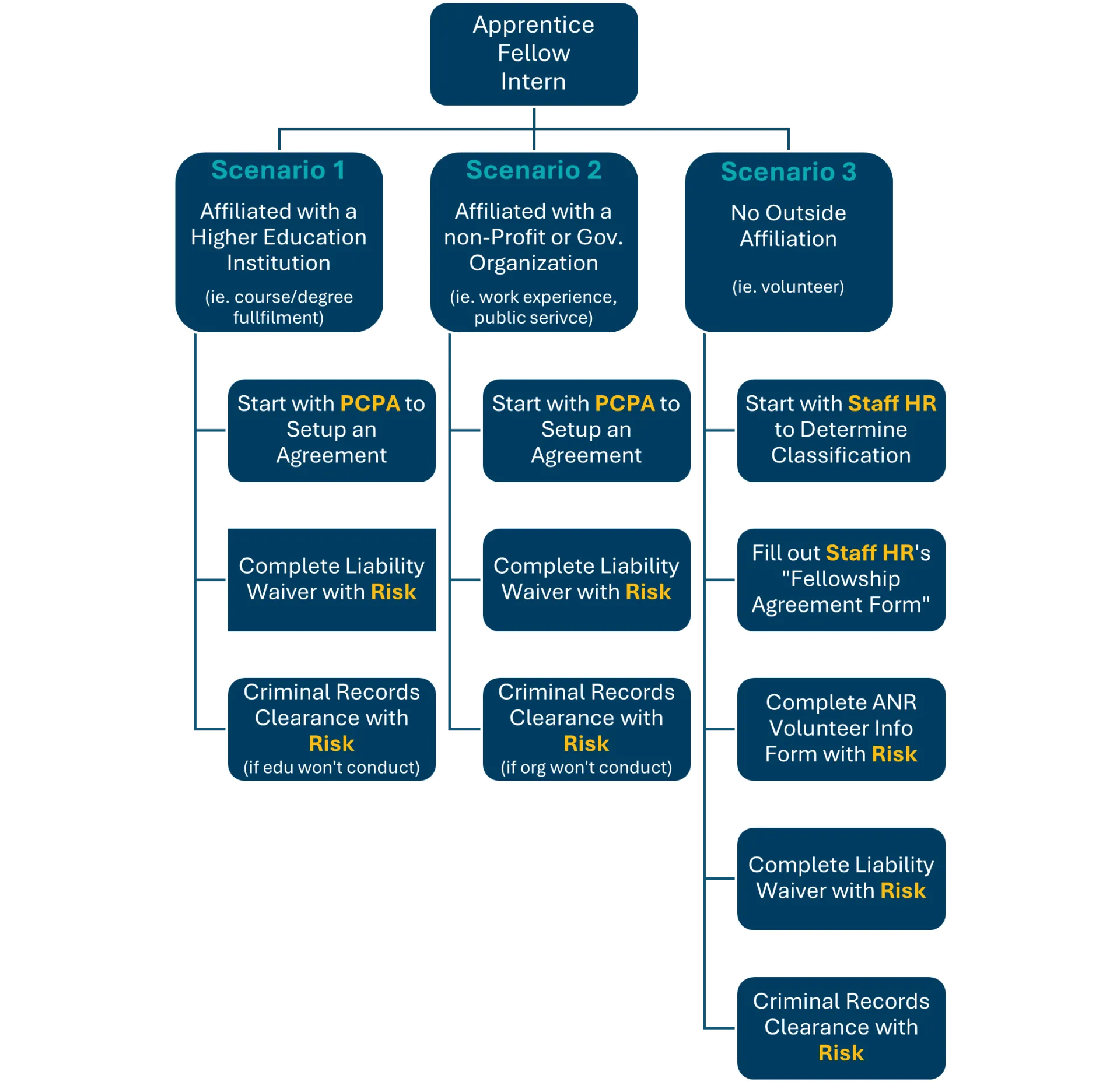 If the Apprentice, Fellow, or Intern does not have an external affiliation, there are still opportunities to gain experience with ANR as a volunteer. Please note that if working directly with a statewide program (e.g., 4-H, MGP, etc.), be sure to follow the specific process for that program.