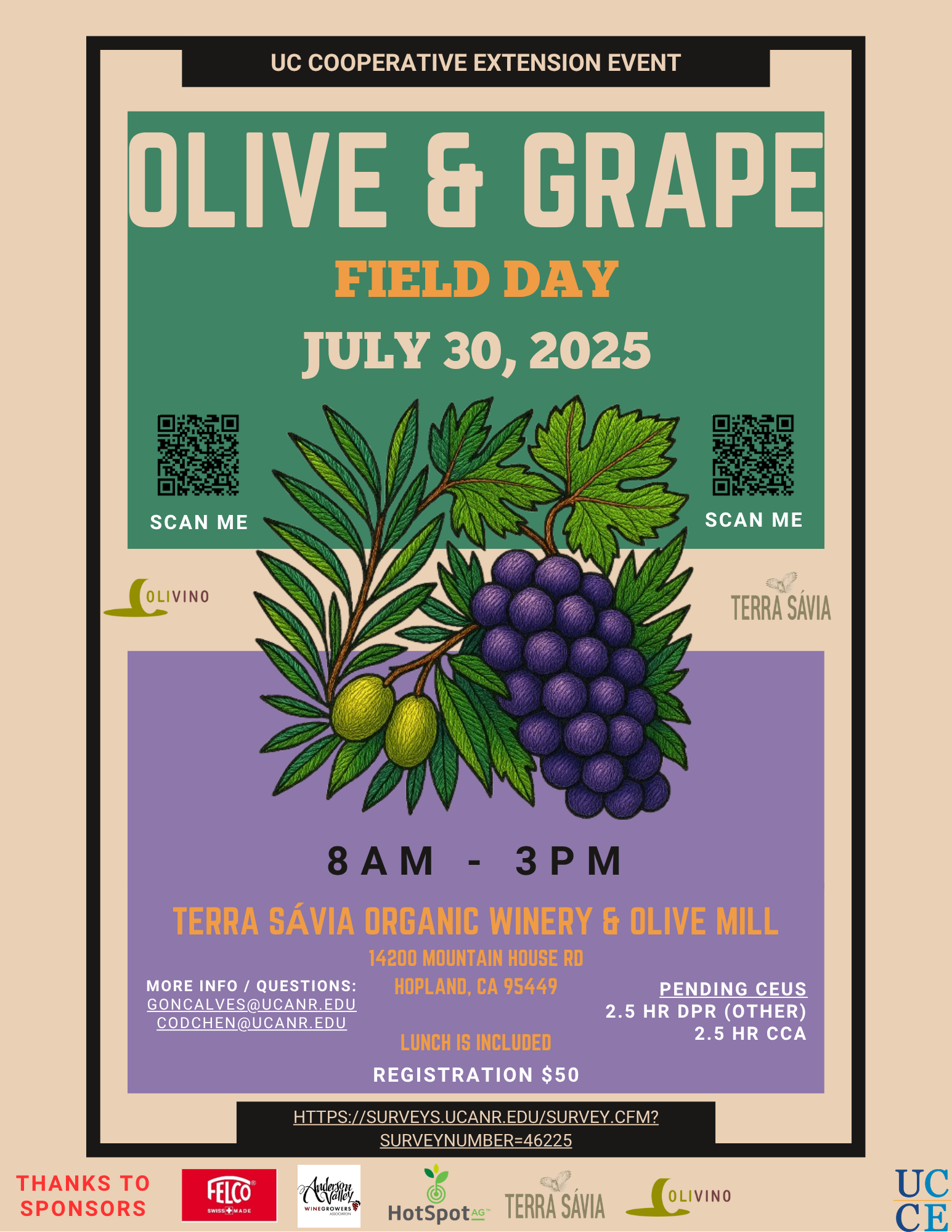 Grape and Olive Day 2025 Google Outlook iCal Registration Link: Event Contact Christopher Chen UCCE Viticulture Advisor codchen@ucanr.edu Clebson Gonçalves UCCE Diversified Agriculture goncalves@ucanr.edu Image Terra Savia/Olivino Registration Fee $50.00 Event Primary Image Olive & Grape Day 2025.png In-Person Event? Yes Certifications Available? No Event Type Workshops Event Date Wed, Jul 30 2025, 8am - 3pm Google Outlook iCal