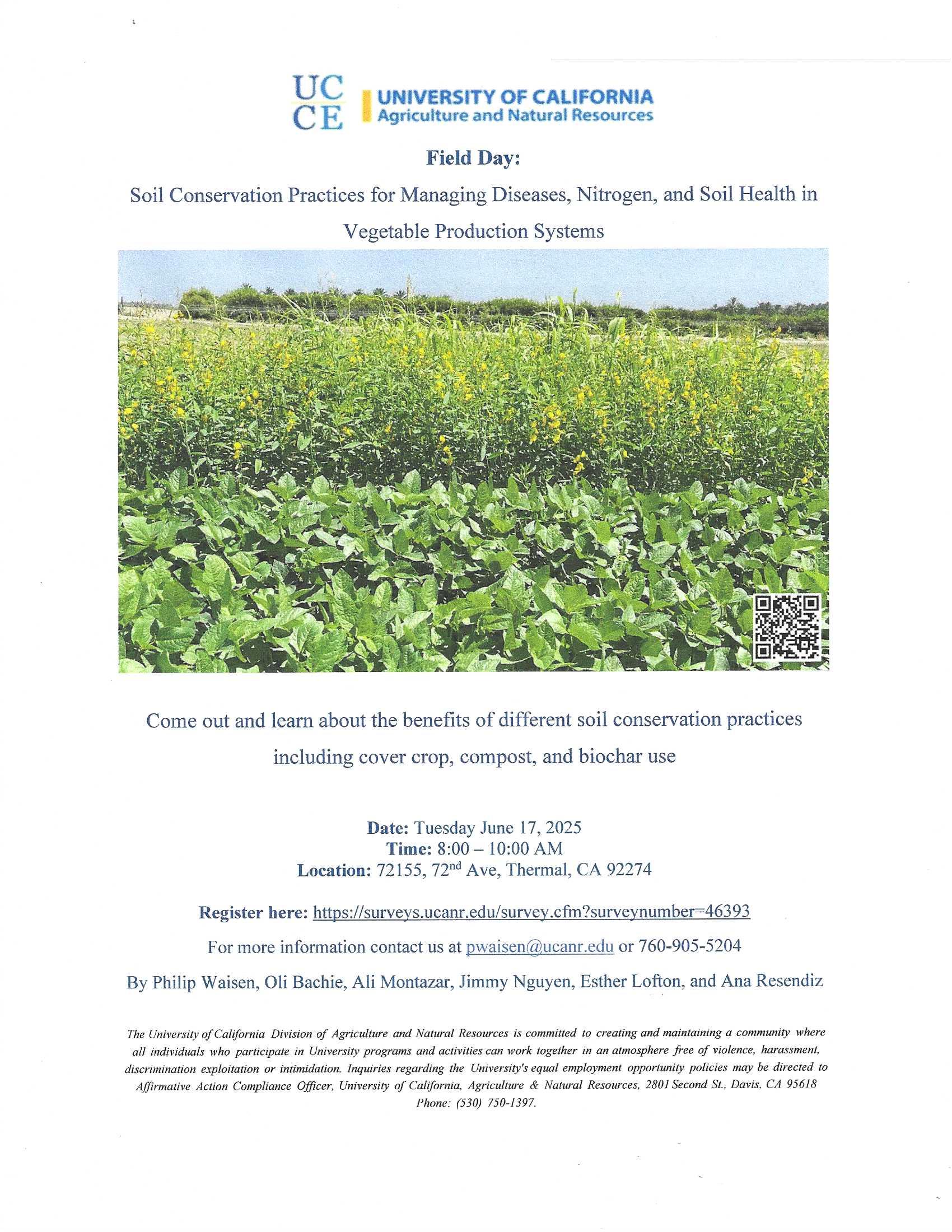 Mark you calendars and join the UCCE Imperial & Riverside advisers for a FREE, Field Day! Where you will learn about the benefits of different soil conservation practices including cover crop, compost and biochar use. Field day will be held in Thermal, CA on June 17, 2025.