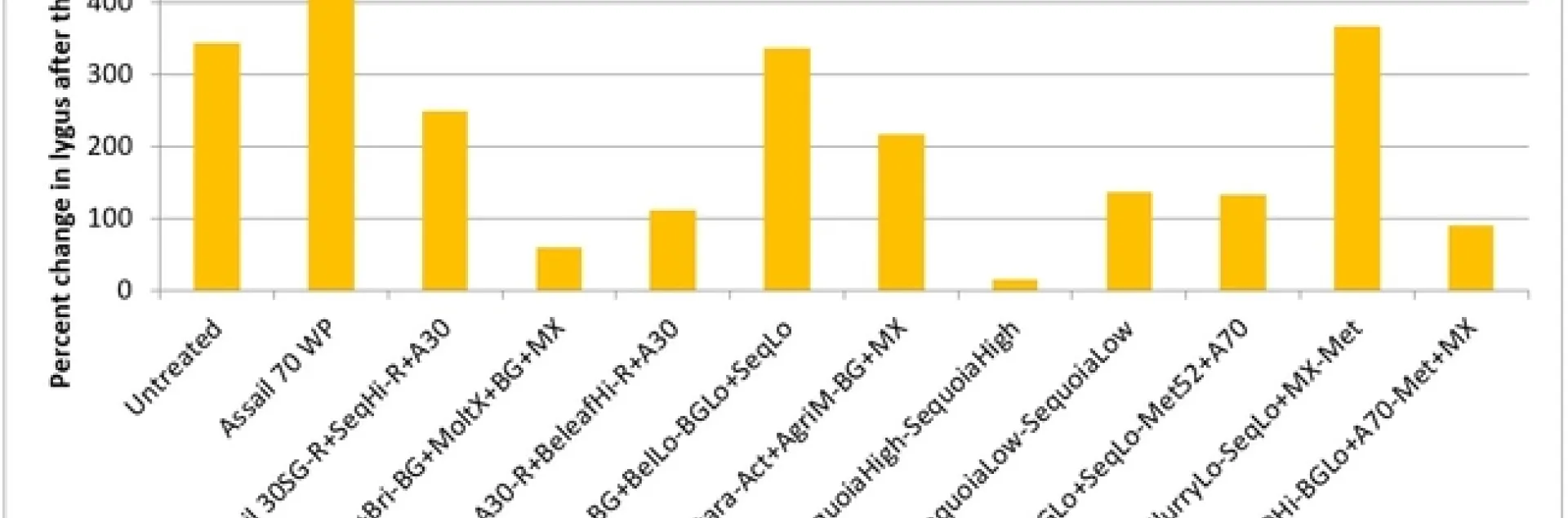 Treatments ranked according to their efficacy as expressed by the percent change/control of lygus bugs after three spray applications.