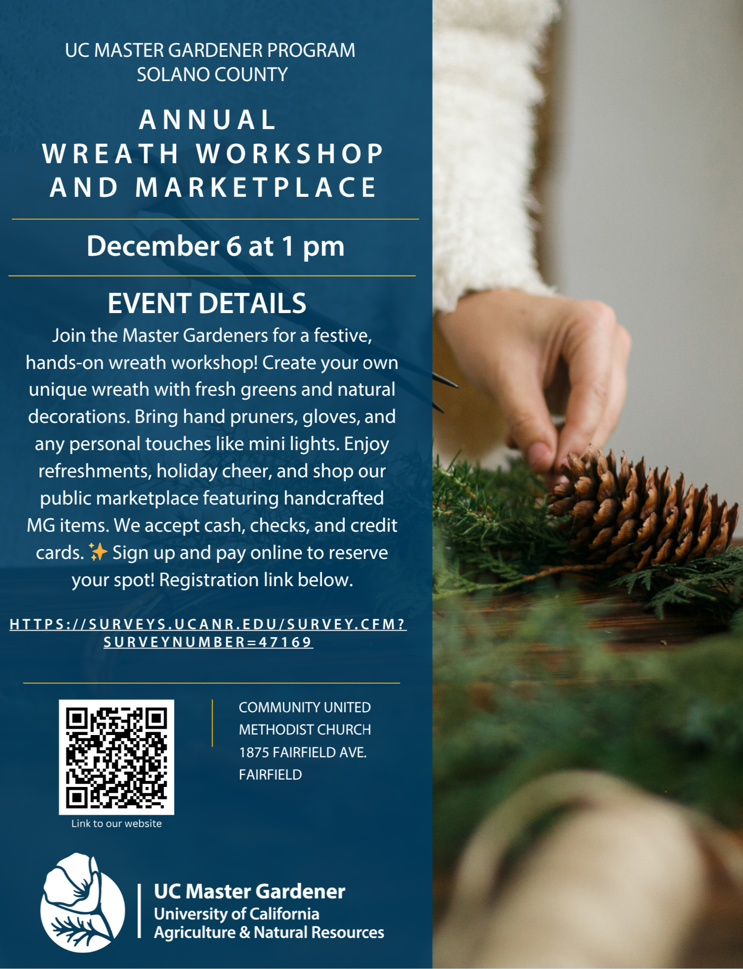 UCCE Master Gardeners-Solano present our annual holiday Wreath Workshop. Saturday, December 6, 2025 from 1:00 to 4:00 pm. The location is the Community Methodist Church at 1875 Fairfield Avenue in Fairfield. There is a fee of $60 which includes access to greens, paddle wire, embellishments, bow and everything needed to create a large wreath. We will have refreshments for you as well. An instructional YouTube video link will be sent to you showing the wreath process, prior to the event. Questions, 707-389-0645 or jmbaumbach@ucanr.edu.