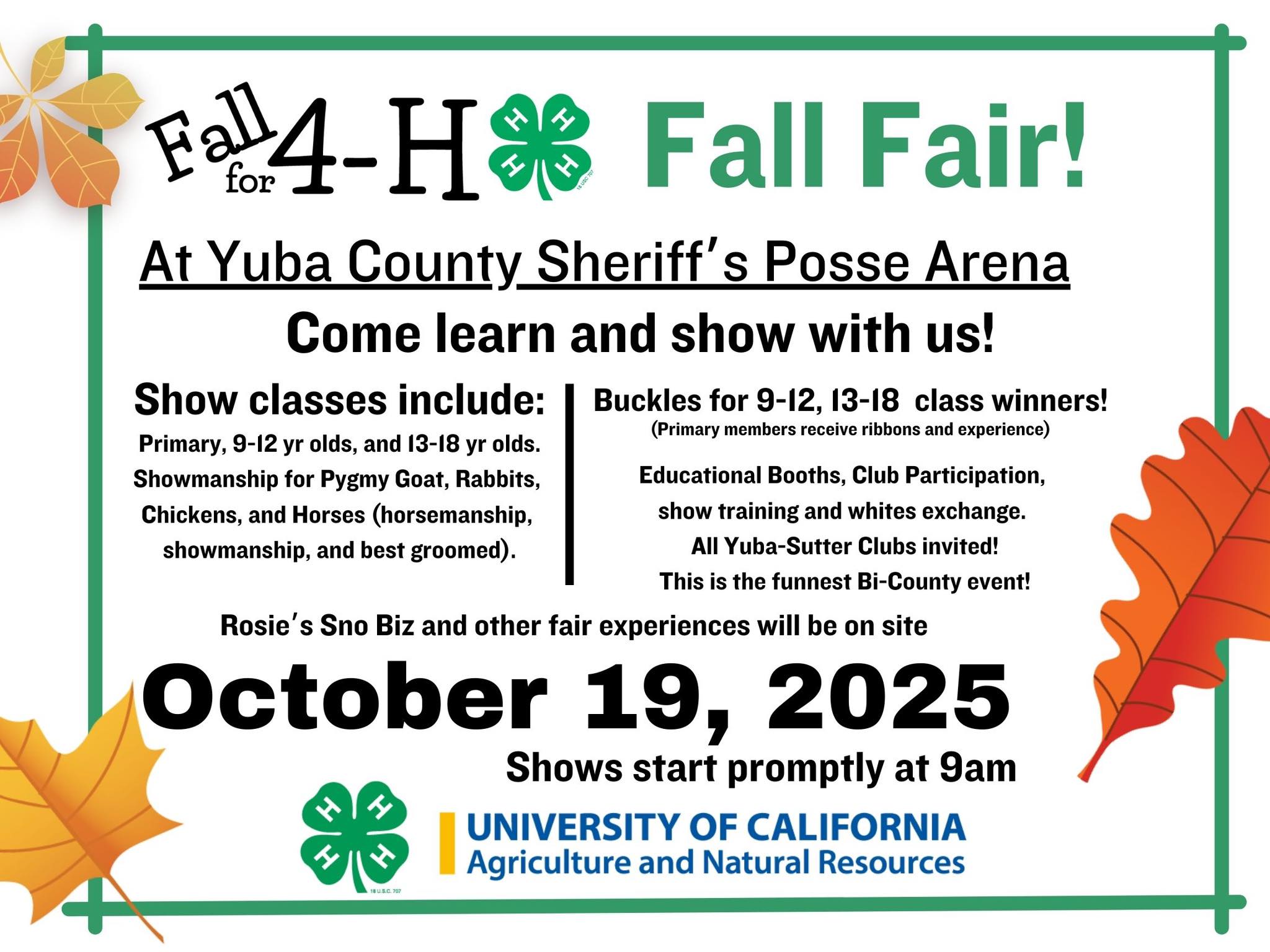 ✨ All Yuba-Sutter 4-H clubs invited! Don’t miss the fun-est Bi-County event of the year. Rosie’s Sno Biz and more will be on site!