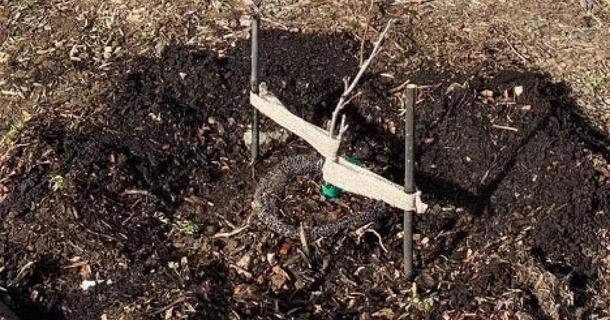 Water slowly and gently until the soil is completely moistened and the tree is settled in place. After the initial watering, water only as needed when rainfall is insufficient. New trees need enough water to encourage root growth, but overwatering can kill them. Drip irrigation can be installed after planting.