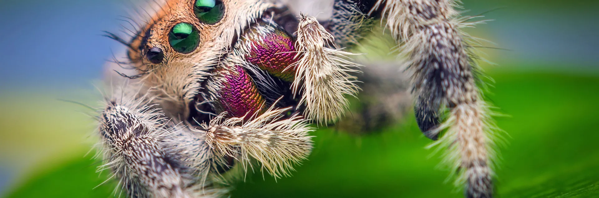 Colorful crab or flower spiders have enlarged front legs that give them a crablike appearance. They hunt during the day and often appear on blossoms where they blend with their background and pounce on unsuspecting prey. Hairy looking jumping spiders are day-active hunters in plants or on the ground. They don’t build webs but stalk and swoop down on their target. With their excellent vision, they have the ability to jump impressive distances for their size.