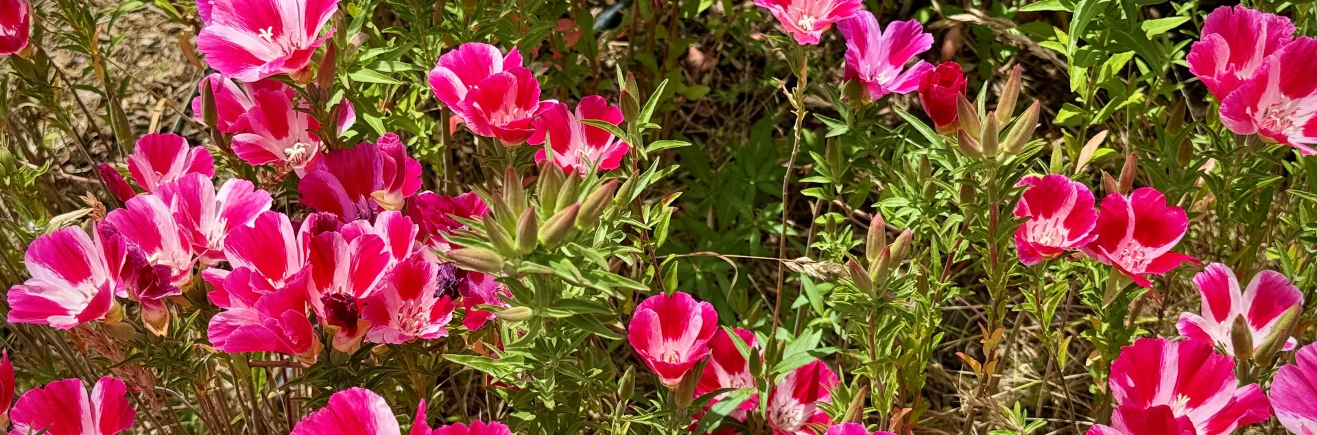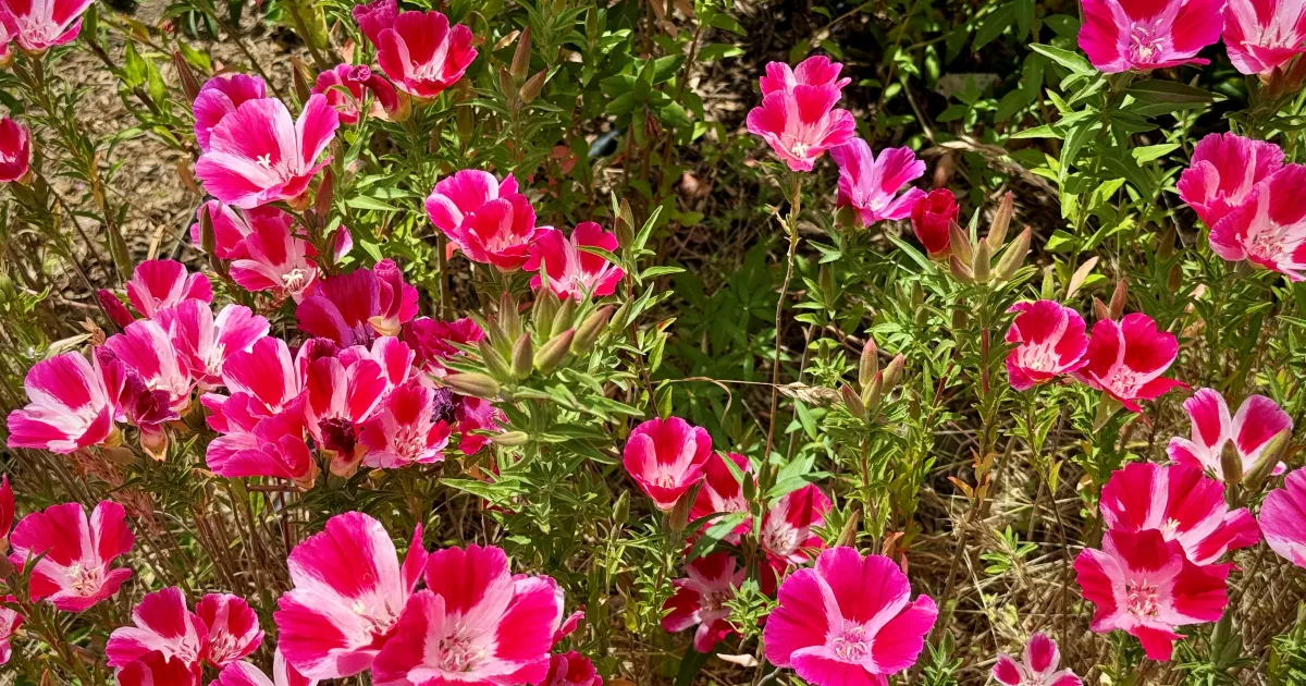 Summer: Red, lavender, blue, yellow, pink, white flowers. Consider Eriogonum (Buckwheat) with white, pink, yellow, or red flowers; Clarkia amoena’s (Farewell to Spring) hot pink flowers; and Achillea millefolium’s (Yarrow) white flowers. Of these, Buckwheat comes in the largest range of sizes – from ground cover to giant shrub. Clarkia is a tall annual flower that re-seeds. Two other reliable favorites for summer flowers are native Penstemons (red, lavender, or blue Beardtongues) and Salvia (Sages with red, lavender, blue, or white flowers.) Choose from hundreds of Penstemon and Sage species for specific color and sun requirements.