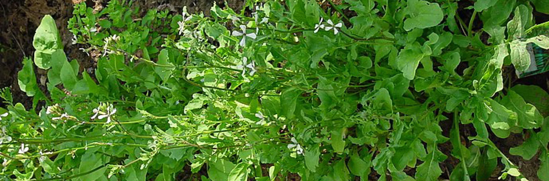 Arugula ("rocket") is a spicy mustard green that is fast and easy to grow. There are two varieties: wild Italian arugula (Eruca selvatica) and common arugula (Eruca vesicaria ssp. sativa). Wild Italian arugula has delicate, peppery foliage and blossoms and small nutty leaves that make it more suited to salads than cooking. It is more heat resistant than common arugula.