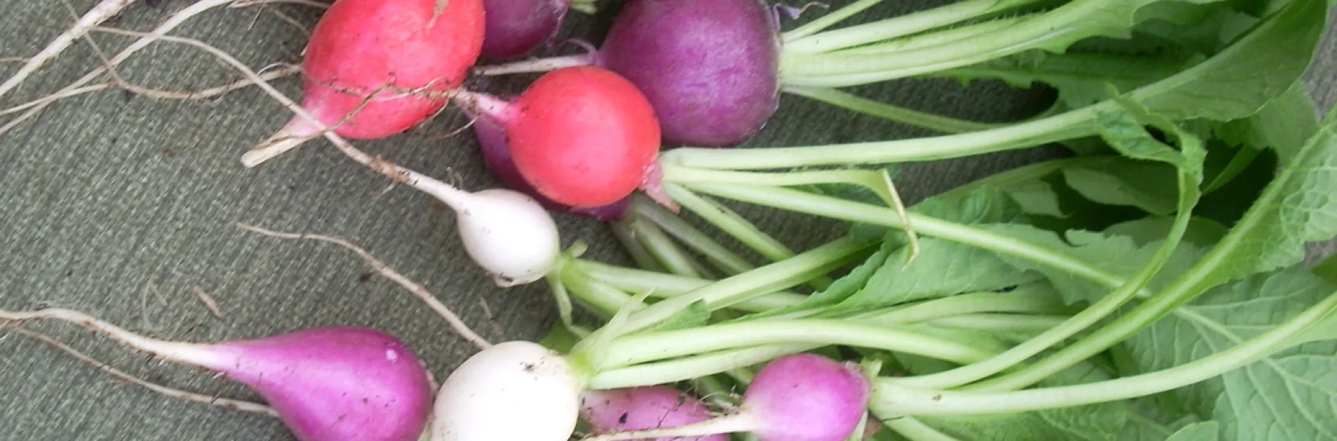 A crisp, peppery, root vegetable in the Brassica family. Both roots and tops may be eaten. Radishes are easy to grow. They are available in many shapes, sizes and colors. Smaller summer radishes mature quickly while larger winter radishes take several months to mature.