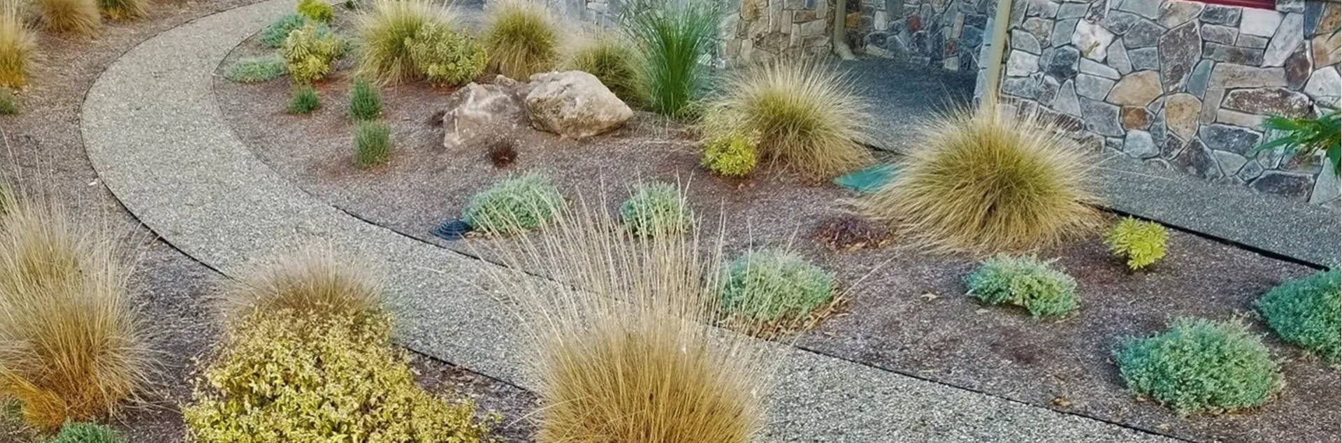 - Break up planted areas into islands of plantings separated by hardscape. If your property is on a steeper slope, then you should increase the thinning between plants.