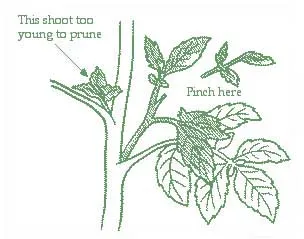Before removing suckers or side shoots on a tomato plant, wait until two leaves develop and pinch above them. See the illustration above.