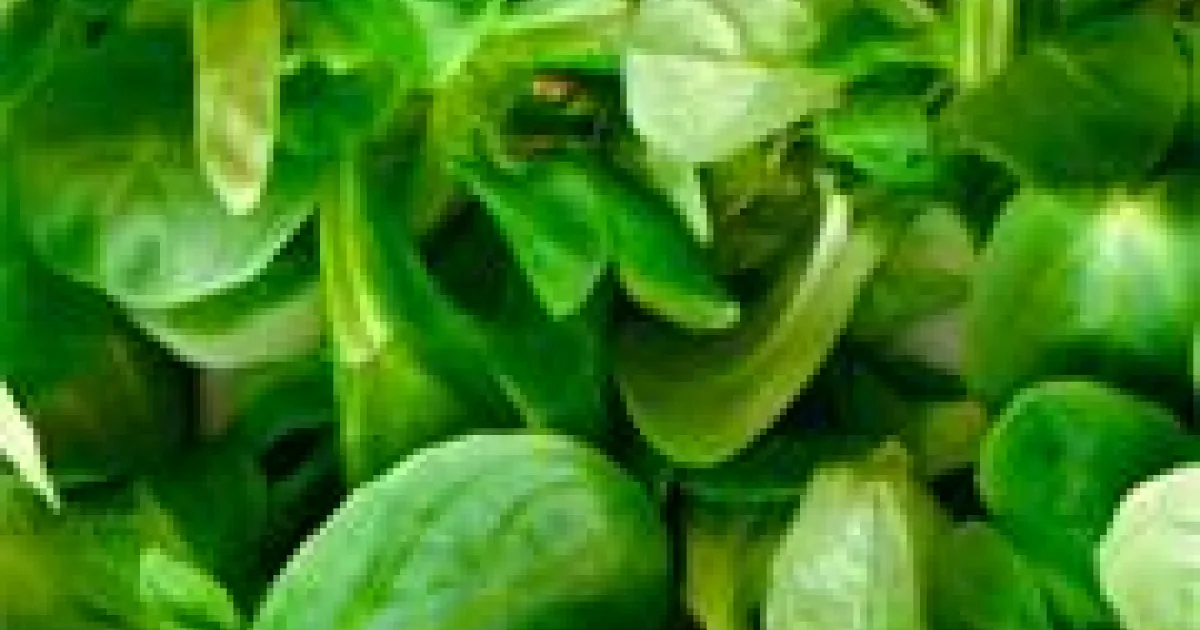 Mâche, Valerianella locusta, is a small, tender salad green, also called corn salad or lamb's lettuce. It is popular in Europe but not well known here. It grows in little rosettes and has a mild, slightly nutty flavor.